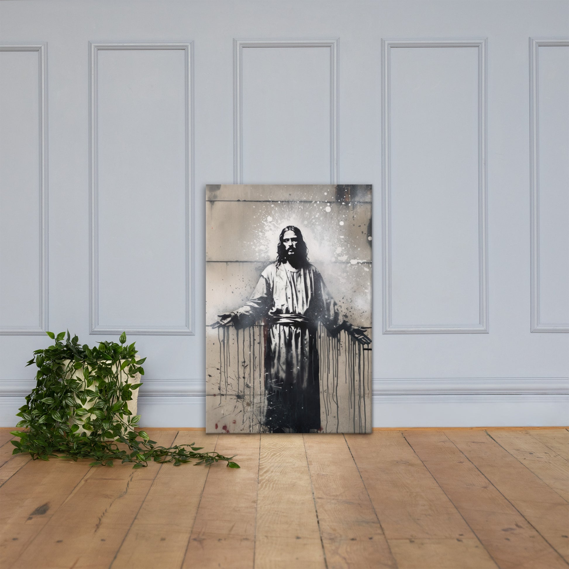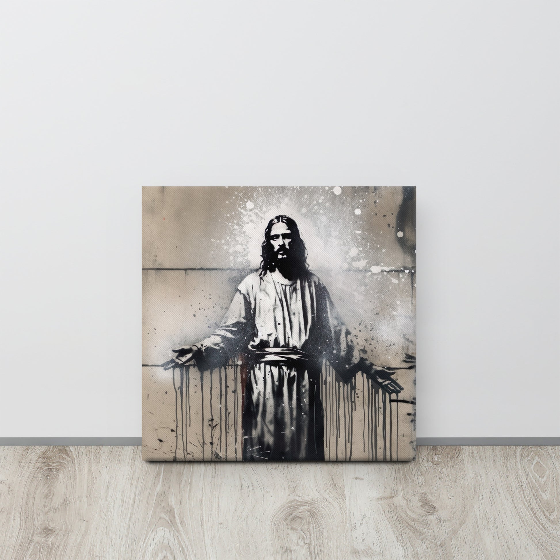 This bold, high-contrast portrait of Christ brings a powerful modern edge to sacred art, blending street-art intensity with spiritual symbolism. “Alpha and Omega” features Jesus standing with open, welcoming arms—an iconic pose rendered in a style reminiscent of Banksy’s sharp stencil work and dramatic urban visuals.