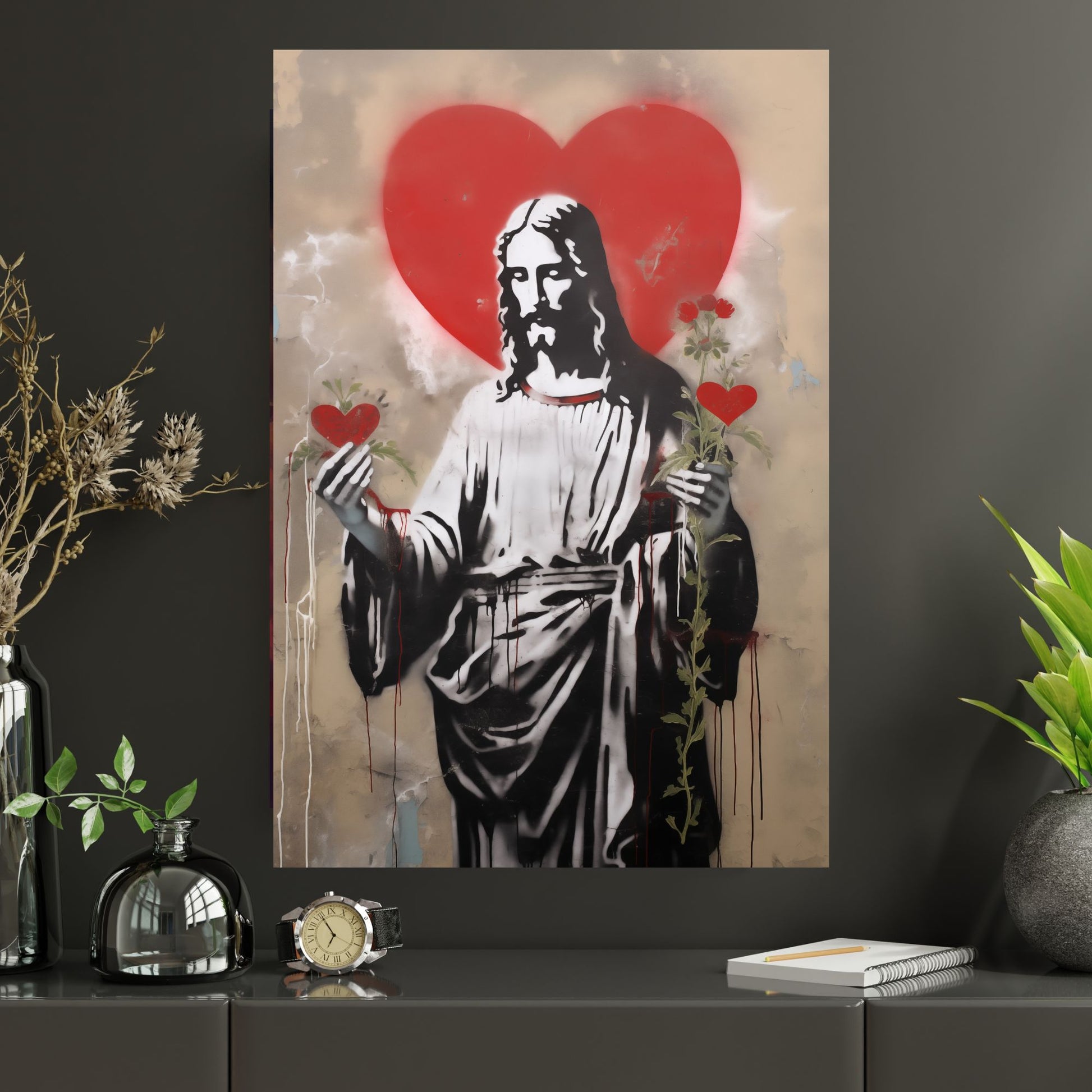 Blessed Heart Of Jesusis a Christian urban street art print inspired by the bold graffiti style of Banksy, featuring Jesus with vivid red hearts and raw, modern stencil detailing. Available in multiple sizes, framed or unframed, it’s perfect for adding edgy, faith-filled character to your home, office, or creative space.