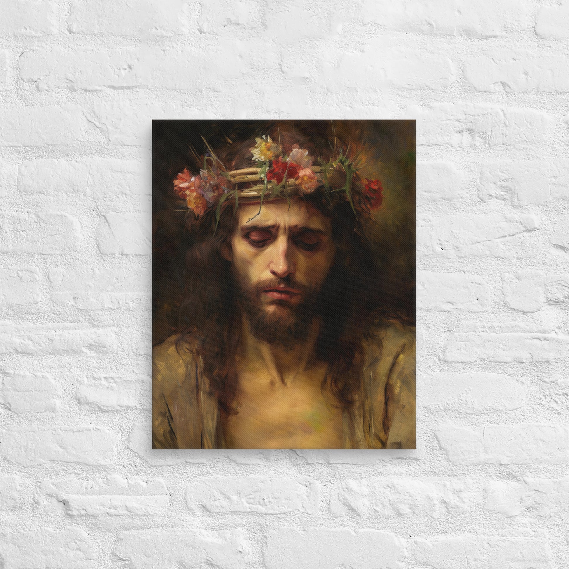 Experience a powerful fusion of beauty and reverence with “Christ’s Crown of Glory,” a classical portrait of Jesus in a luminous realism style. This unique depiction shows Christ wearing a crown of thorns interwoven with delicate flowers, symbolizing both His suffering and His victory. Soft lighting, refined detail, and a gentle, dignified expression create a moving, timeless work of art.