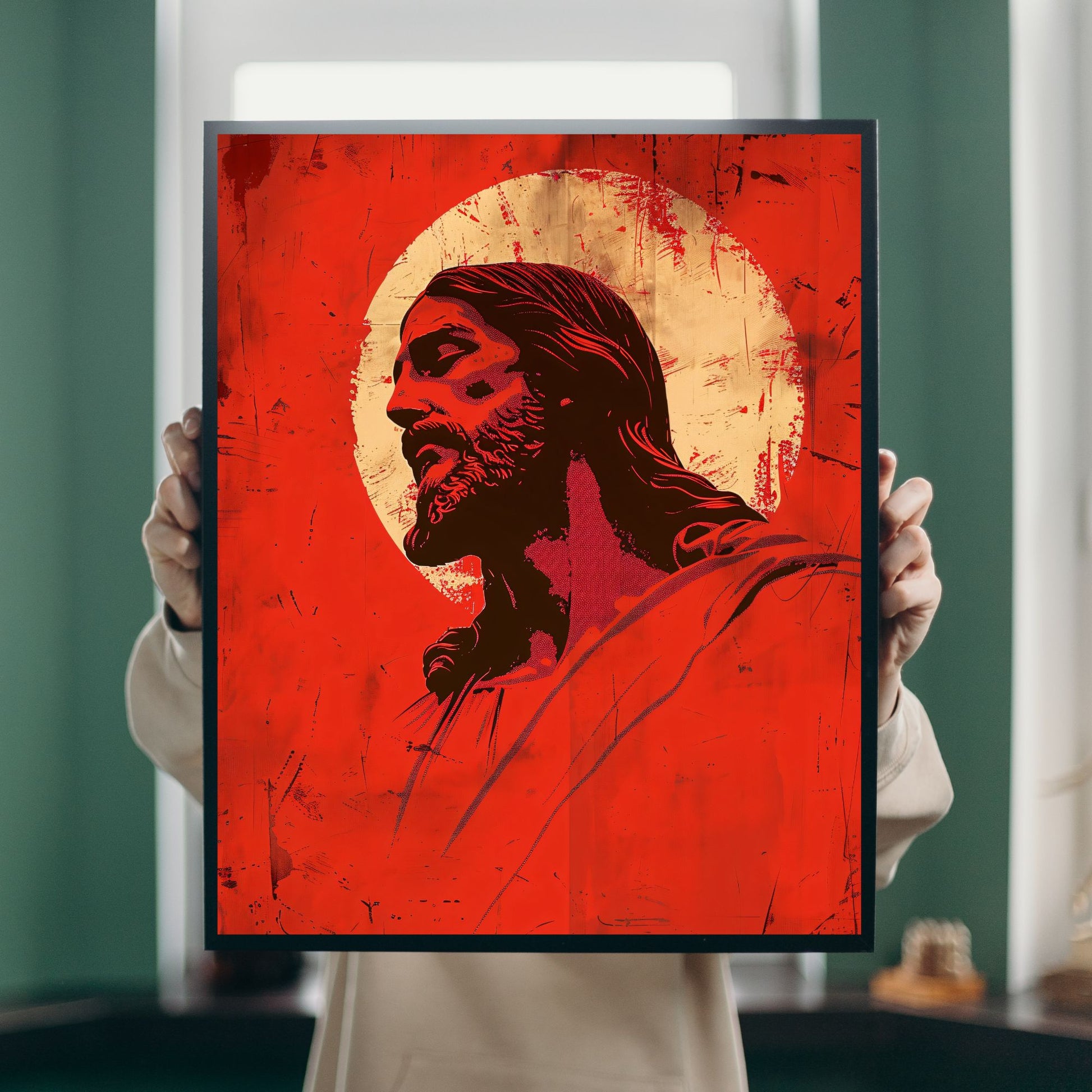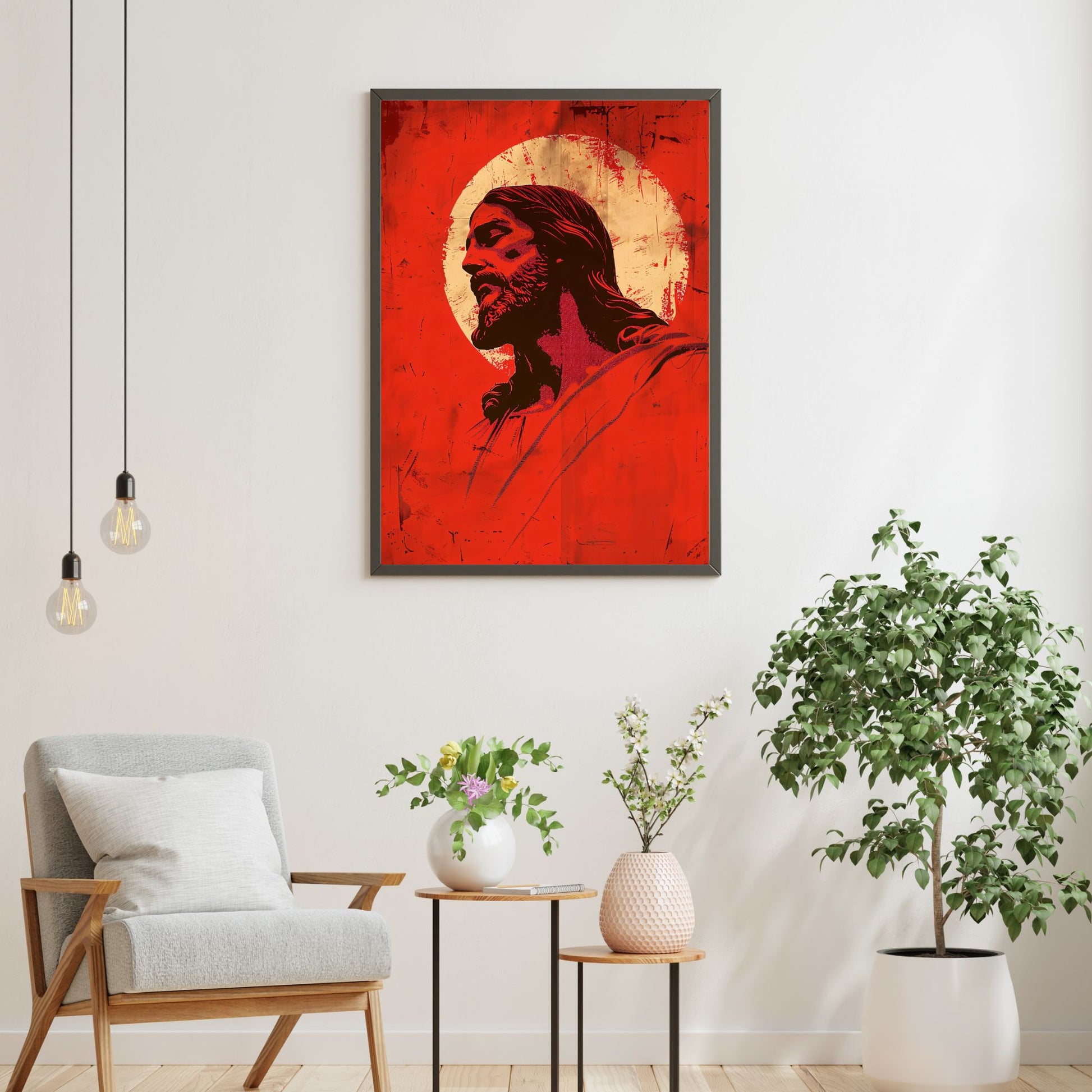 Crimson Christ is a minimalist-style modern graphic art print featuring Jesus with bold, expressive lines set against a vivid red and gold background that evokes sacrifice, power, and spiritual depth. Available in multiple sizes, framed or unframed, it’s designed to add dramatic, faith-filled artistry to your home, office, or church.