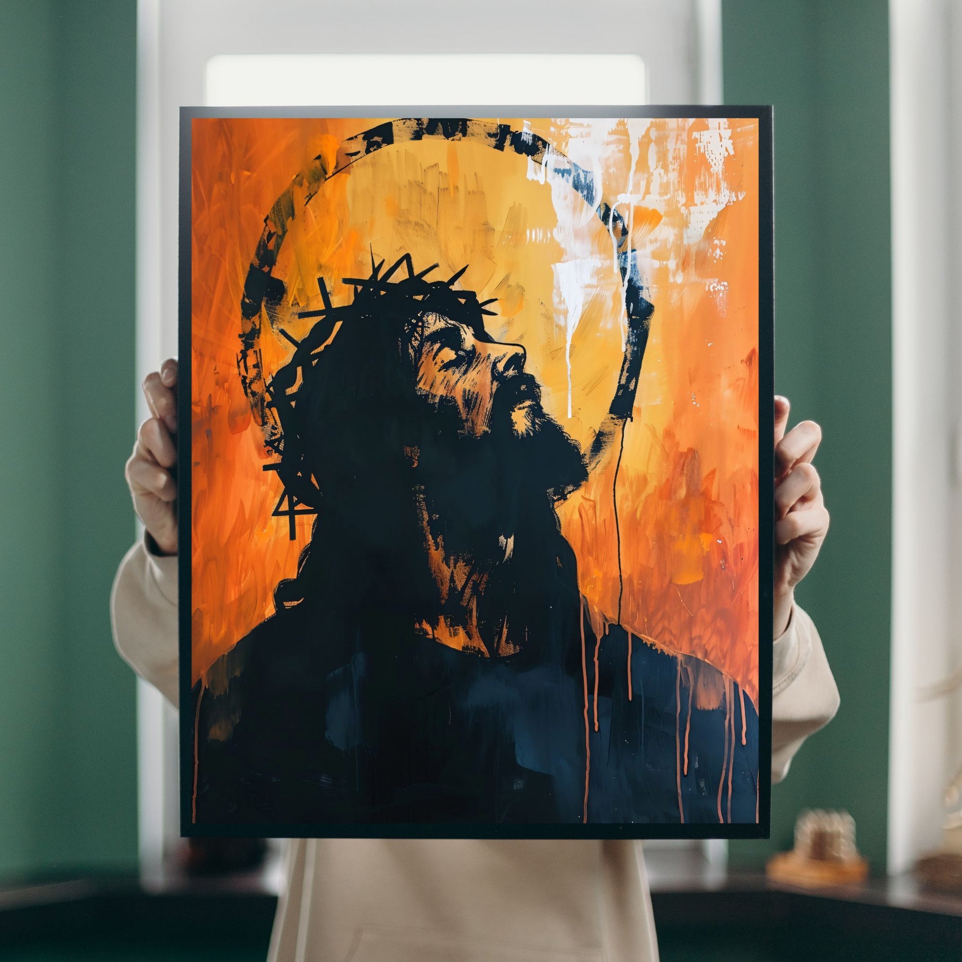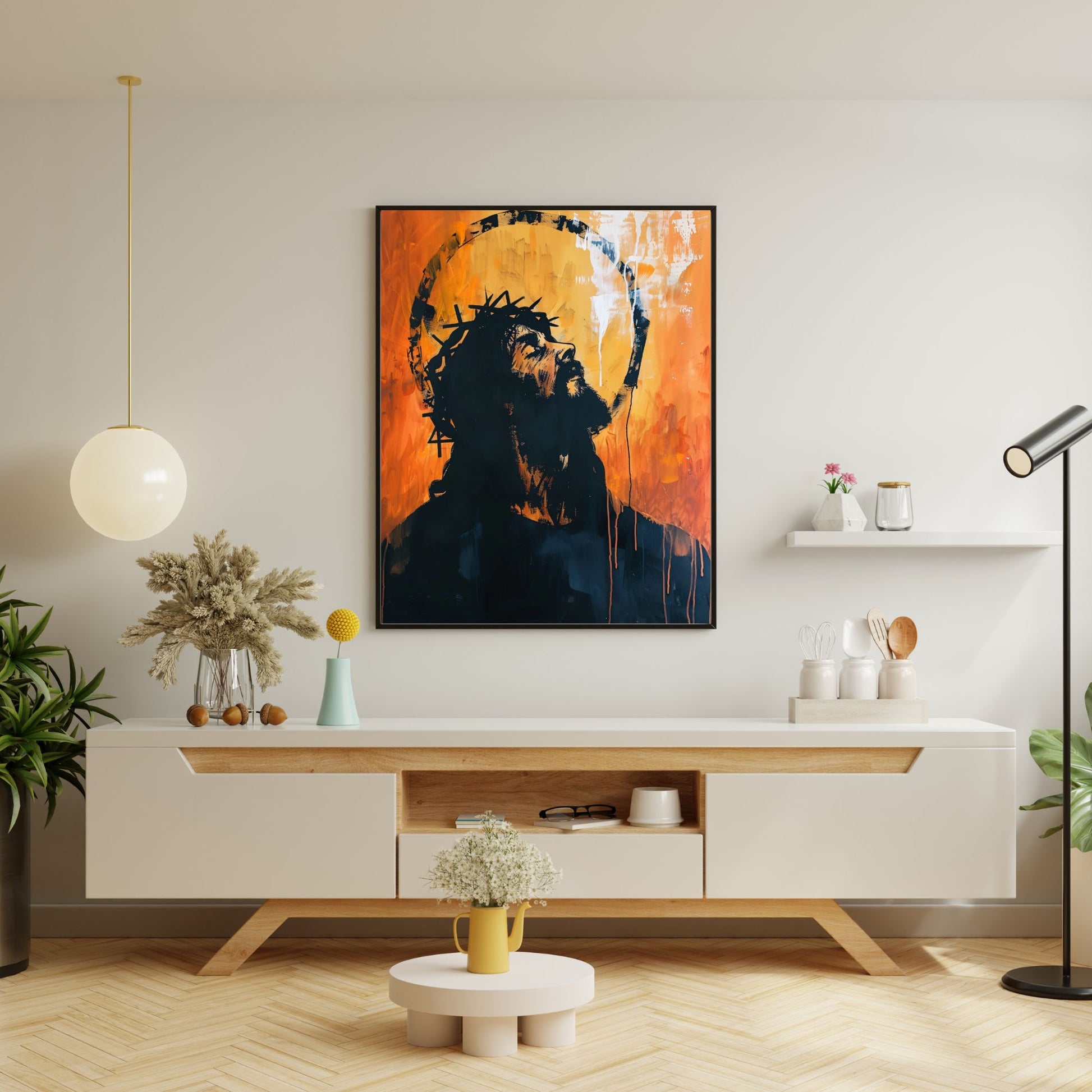 Crown Of Love is a minimalist modern art print featuring Jesus with a crown of thorns, his face uplifted in solemn strength, surrounded by bold, fiery tones and expressive textures. Available in multiple sizes, framed or unframed, it’s designed to bring striking, faith-filled artistry to your home, office, or church.