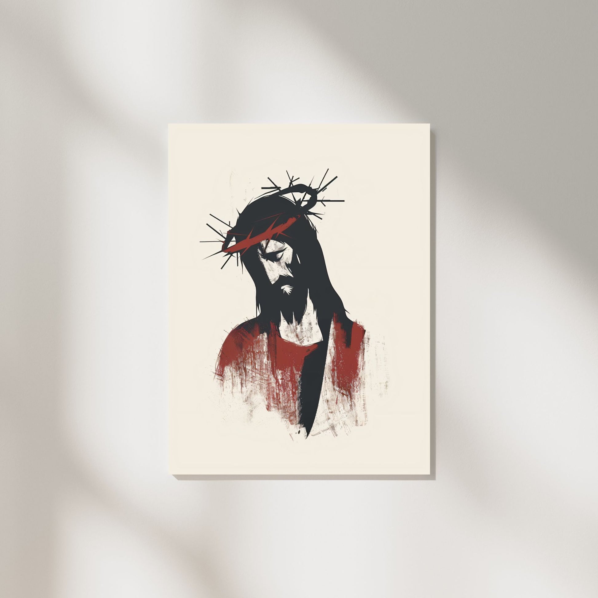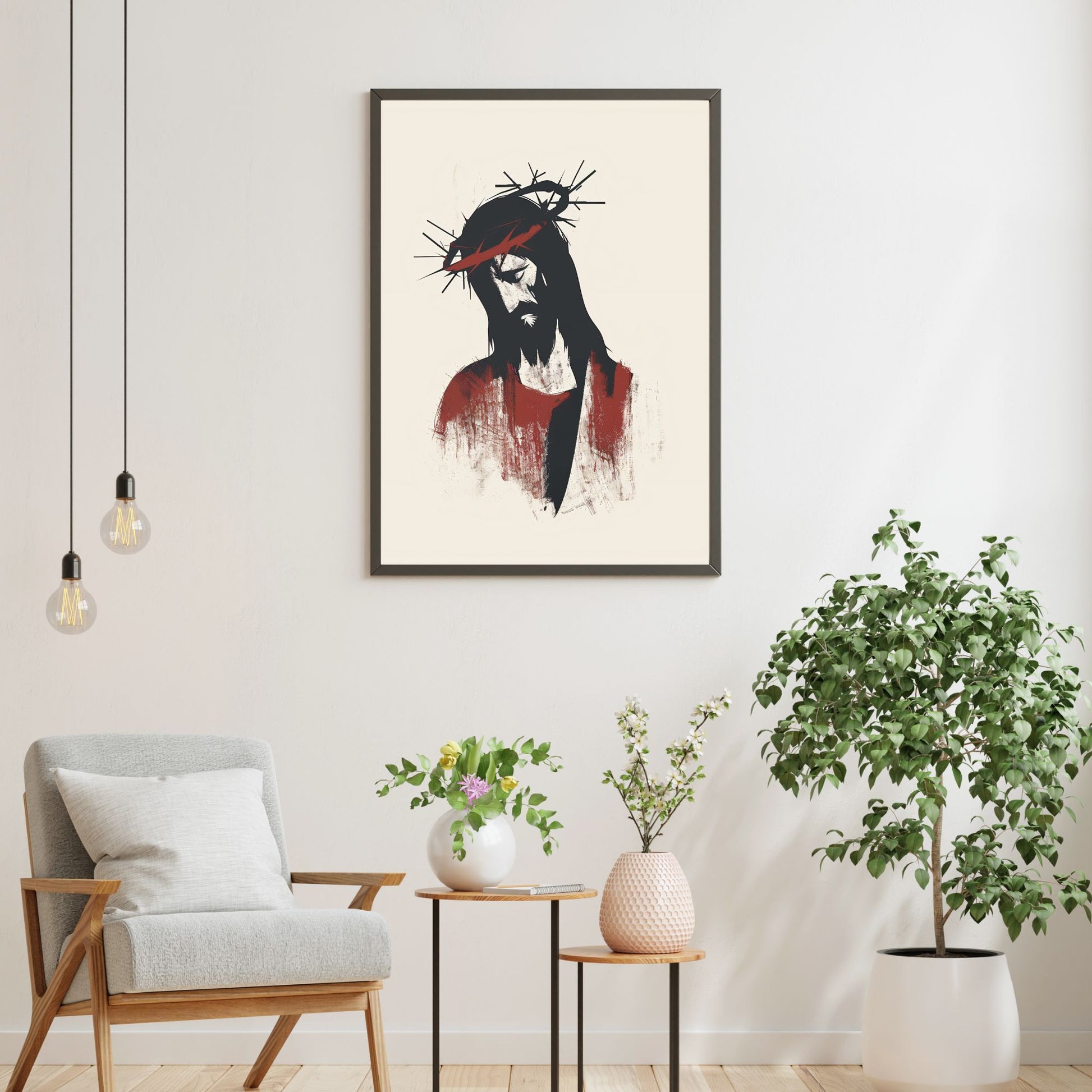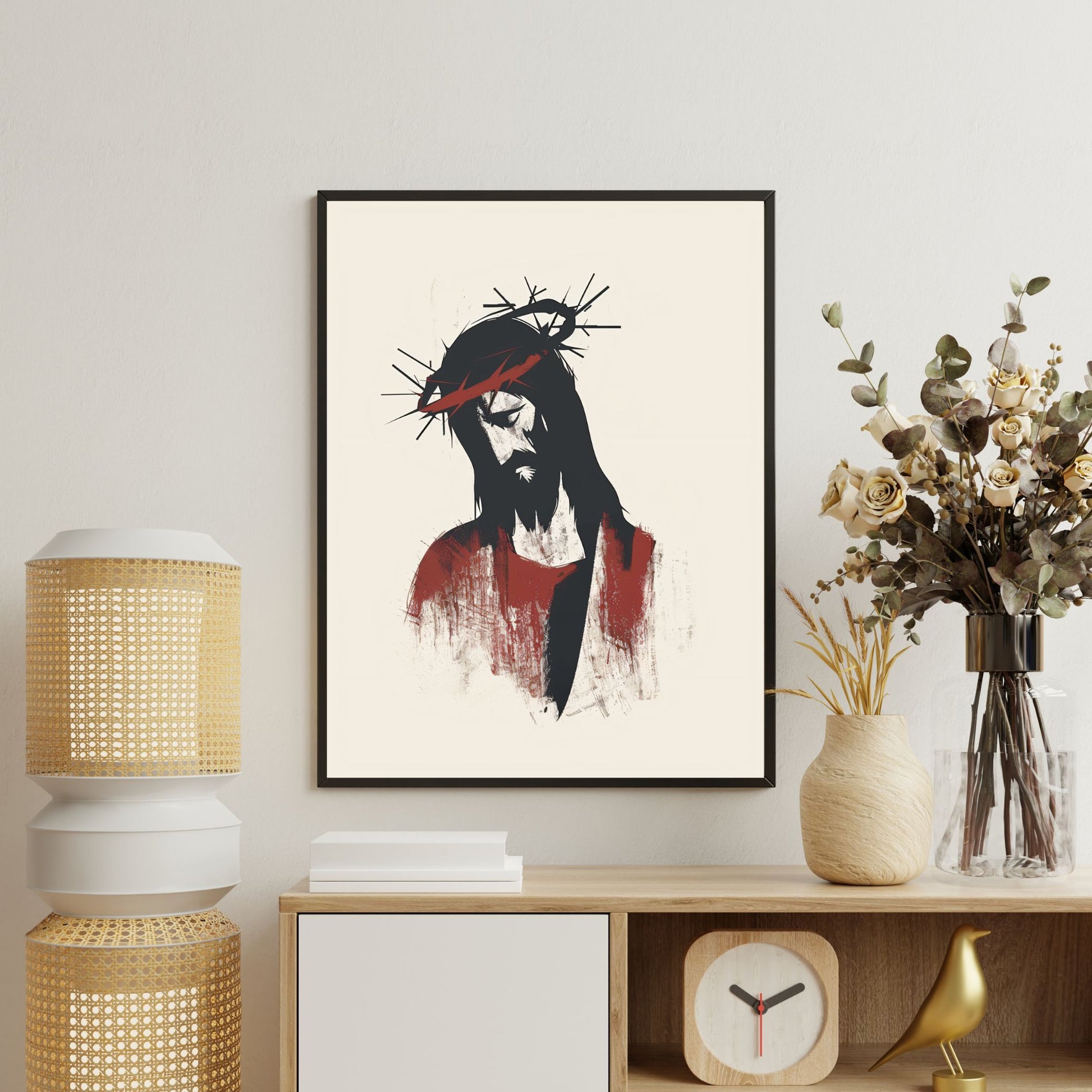 Crown Of Thorns is a minimalist midcentury modern art print featuring Jesus with stark, expressive lines and subdued red accents, evoking solemn reflection and timeless design. Available in multiple sizes, framed or unframed, it’s crafted to bring contemplative, faith-filled style to your home, office, or church.