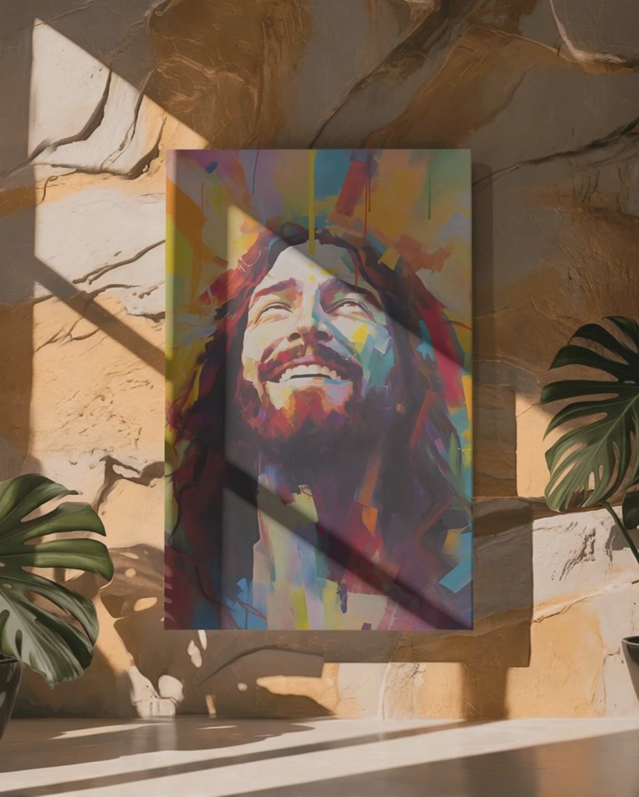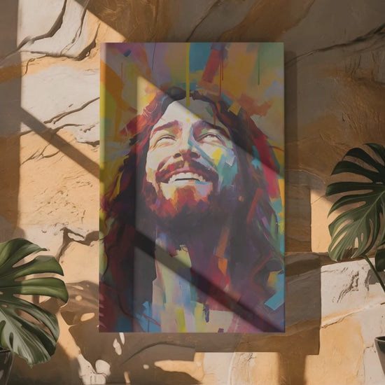 Bring the Joyful and Radiant spirit of Christ into your home with our captivating "Divine Joy" premium canvas wall art. This breathtaking, vibrant boho-eclectic portrait of Jesus captures Him laughing in colorful, expressive brushstrokes that truly celebrate hope, love, and spiritual freedom.