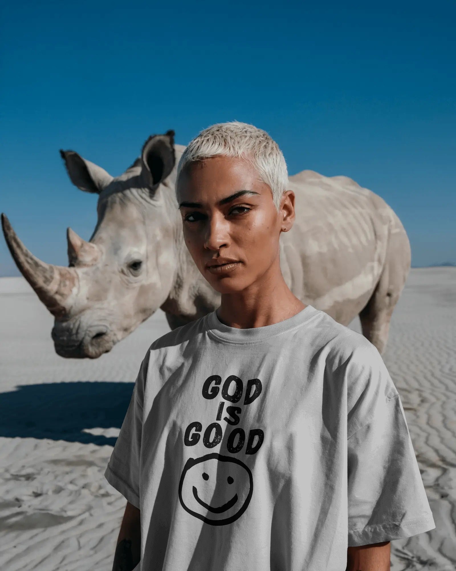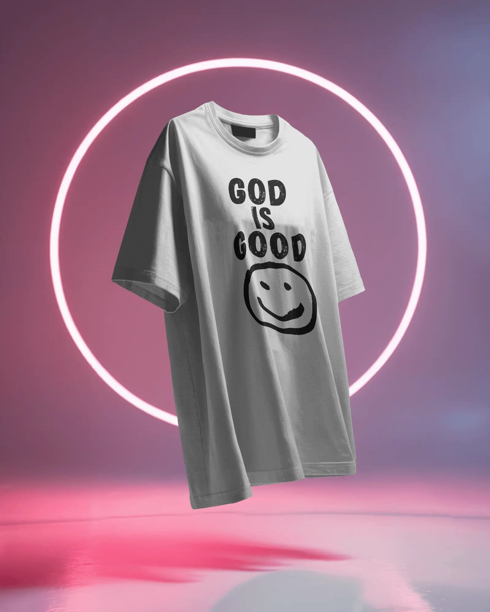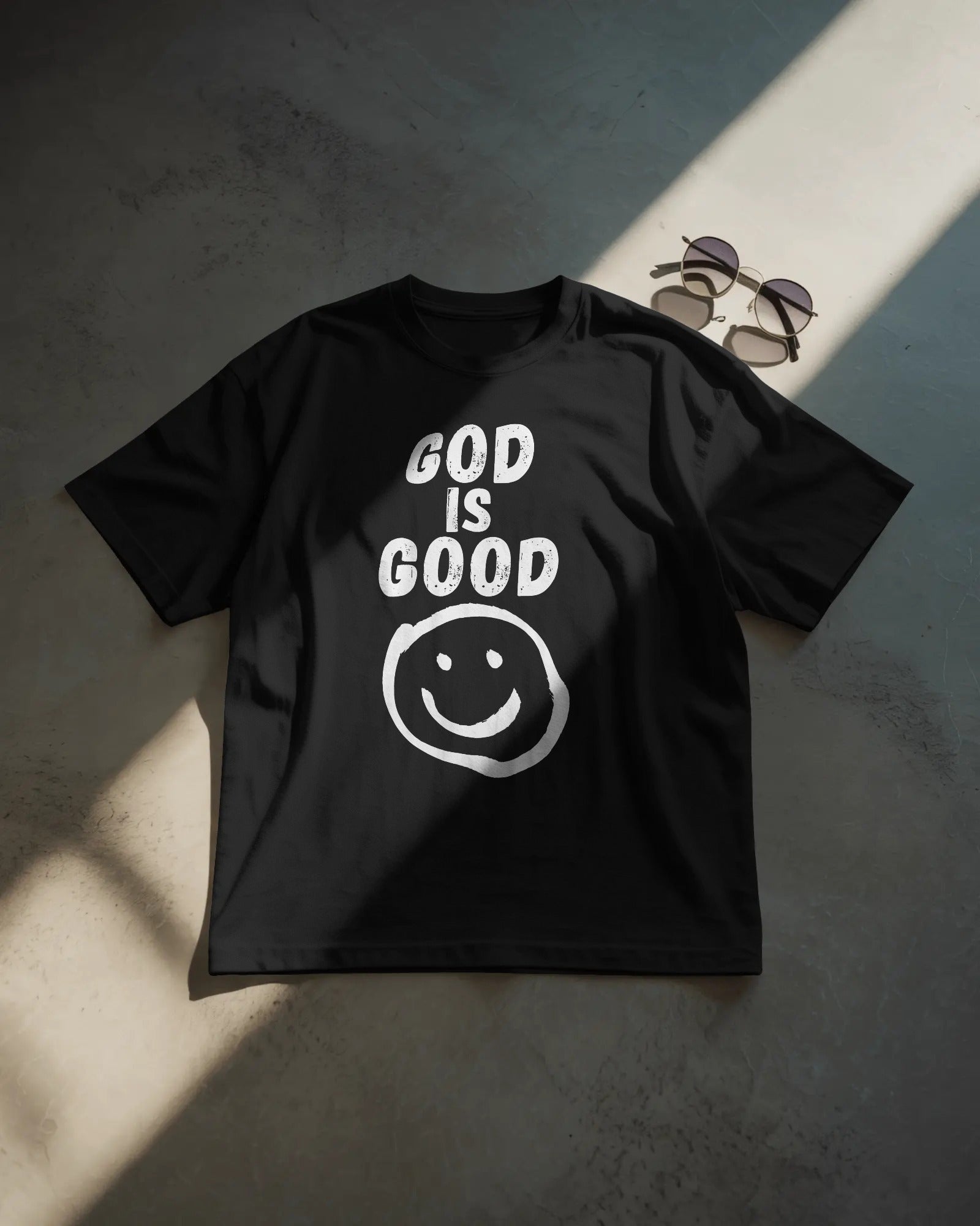 Introducing our God Is Good smiley-face Christian black and white t-shirts.