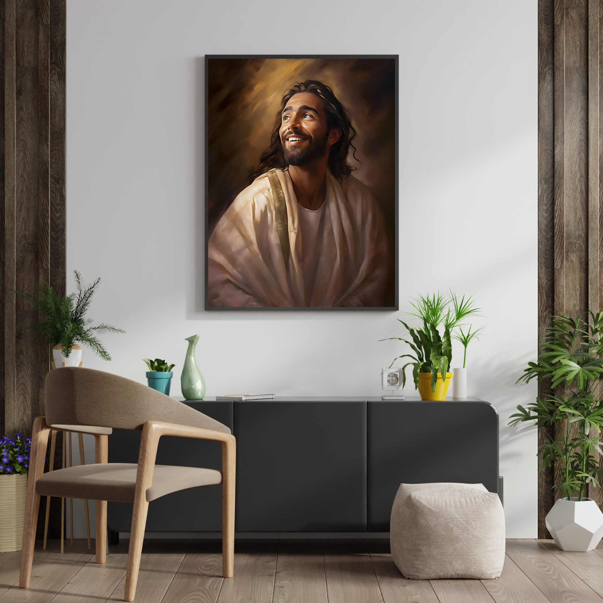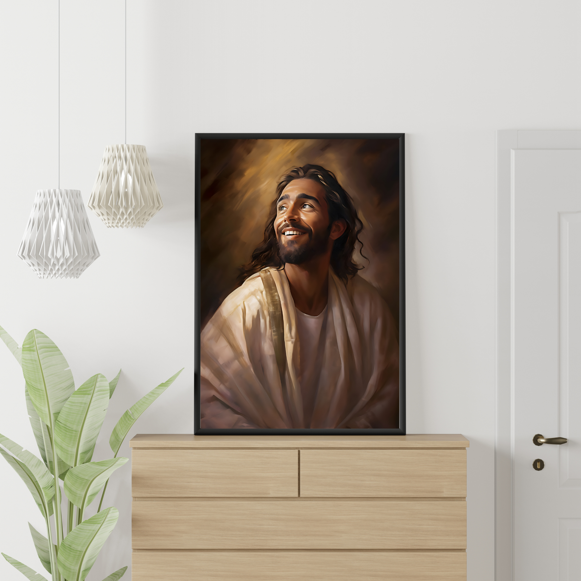 The Good Shepherd is a timeless Christian wall art print that depicts Jesus with a warm, welcoming smile and soft golden tones. This traditional portrait evokes peace, kindness, and divine guidance, making it ideal for prayer rooms, living spaces, or churches. Let this beautifully detailed artwork inspire faith and a sense of comforting presence in your home.