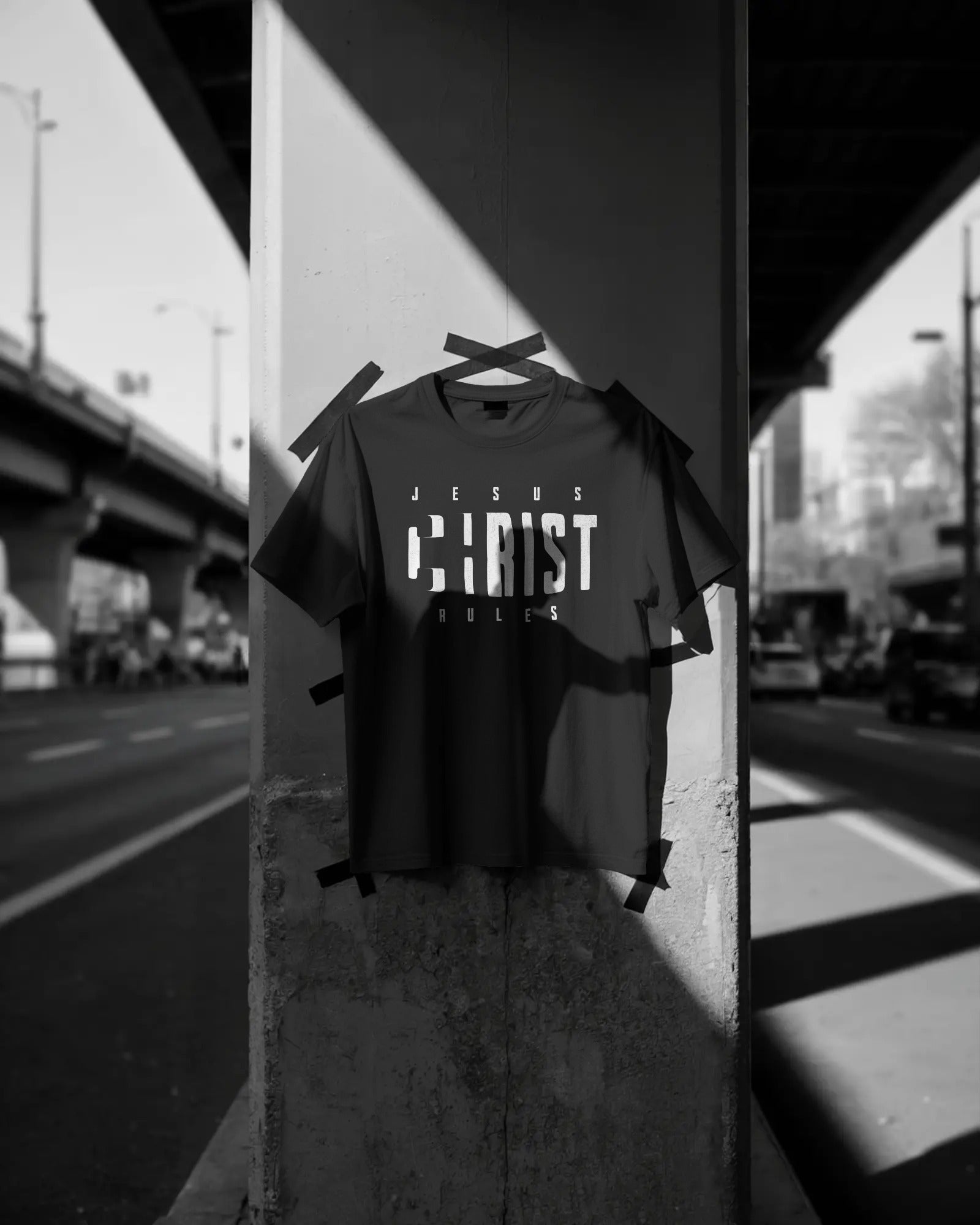 Showcase your faith boldly with our Jesus Christ Rules Christian T-shirt, featuring a striking minimalist design with distressed lettering that plays with perception and space.