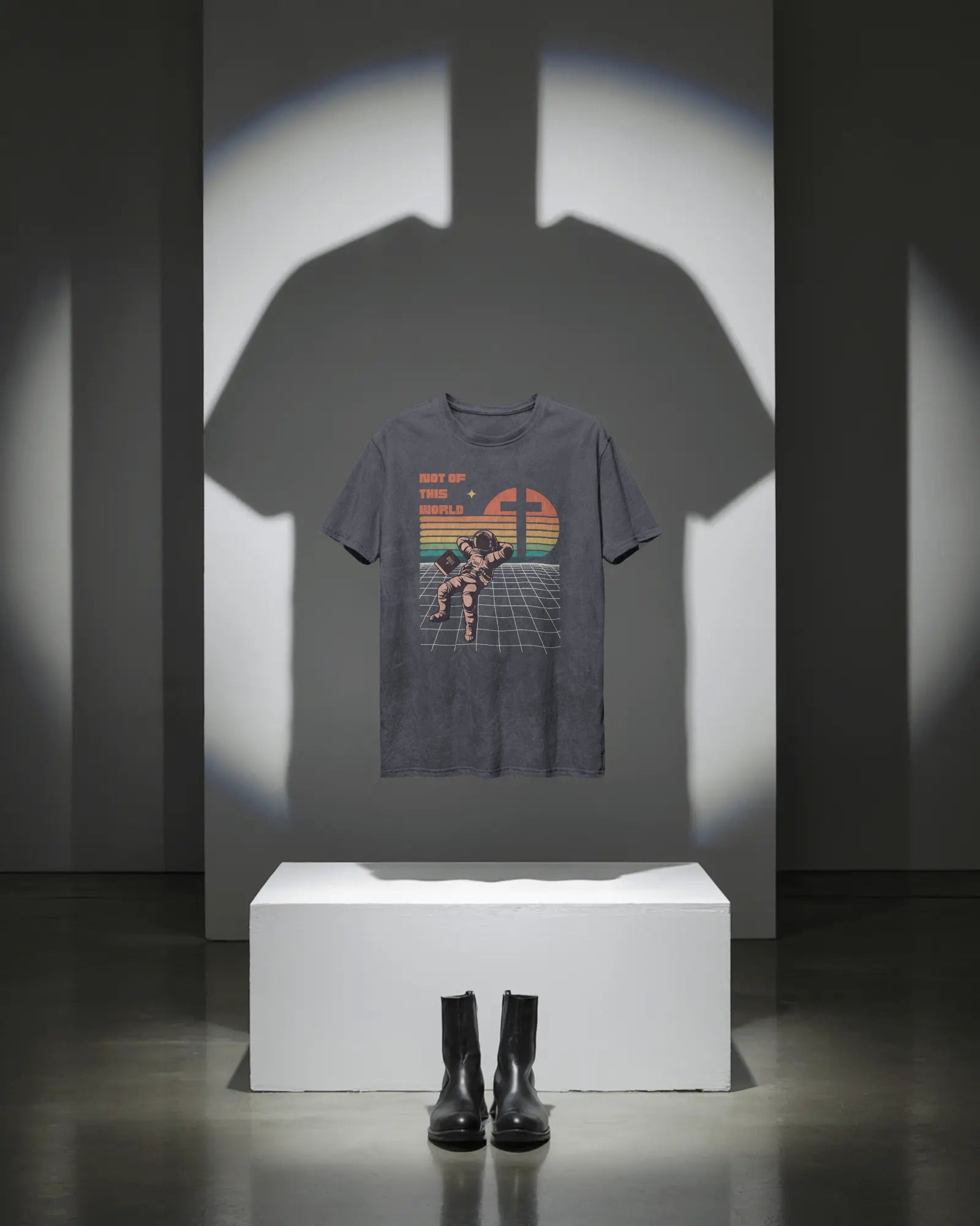 This unique Christian Teeshirt is a stylish statement of faith that is sure to spark conversations and give you opportunity to share your testimony about Jesus! In fact, there's a fun "easter egg" hidden in this cool Christian retro T-shirt . . . Look closely at the astronaut's helmet and you'll see the words, "John 15:19"!