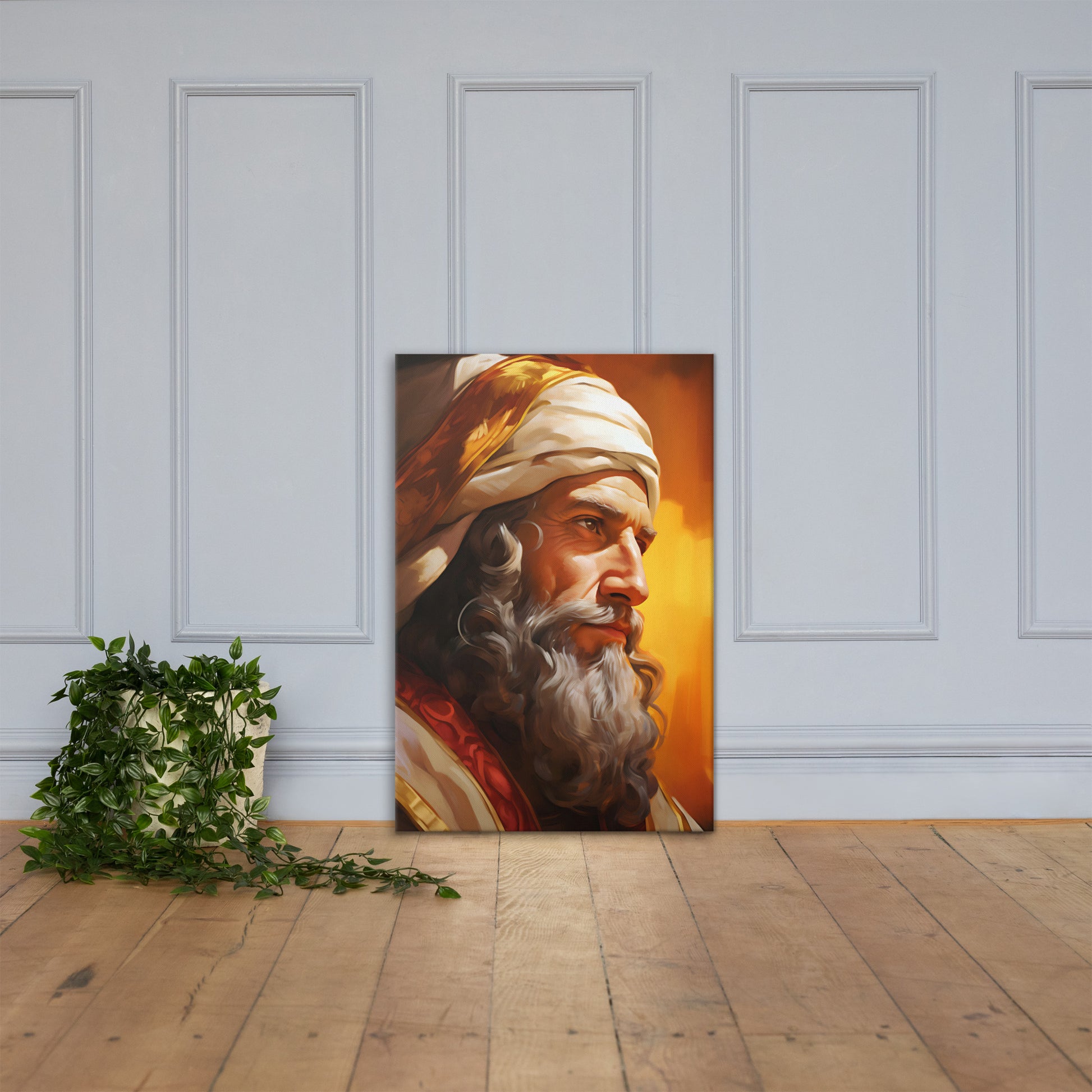 This striking classical portrait brings King Solomon to life with noble presence and refined, lifelike detail. “King Solomon The Wise” features a radiant backdrop of rich golden-orange tones, giving the piece a vibrant, dynamic energy that highlights his wisdom, authority, and God-given discernment.