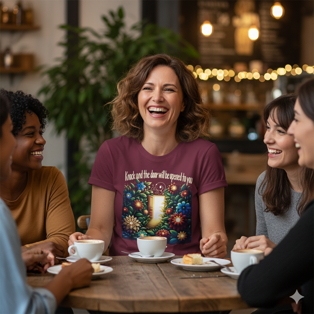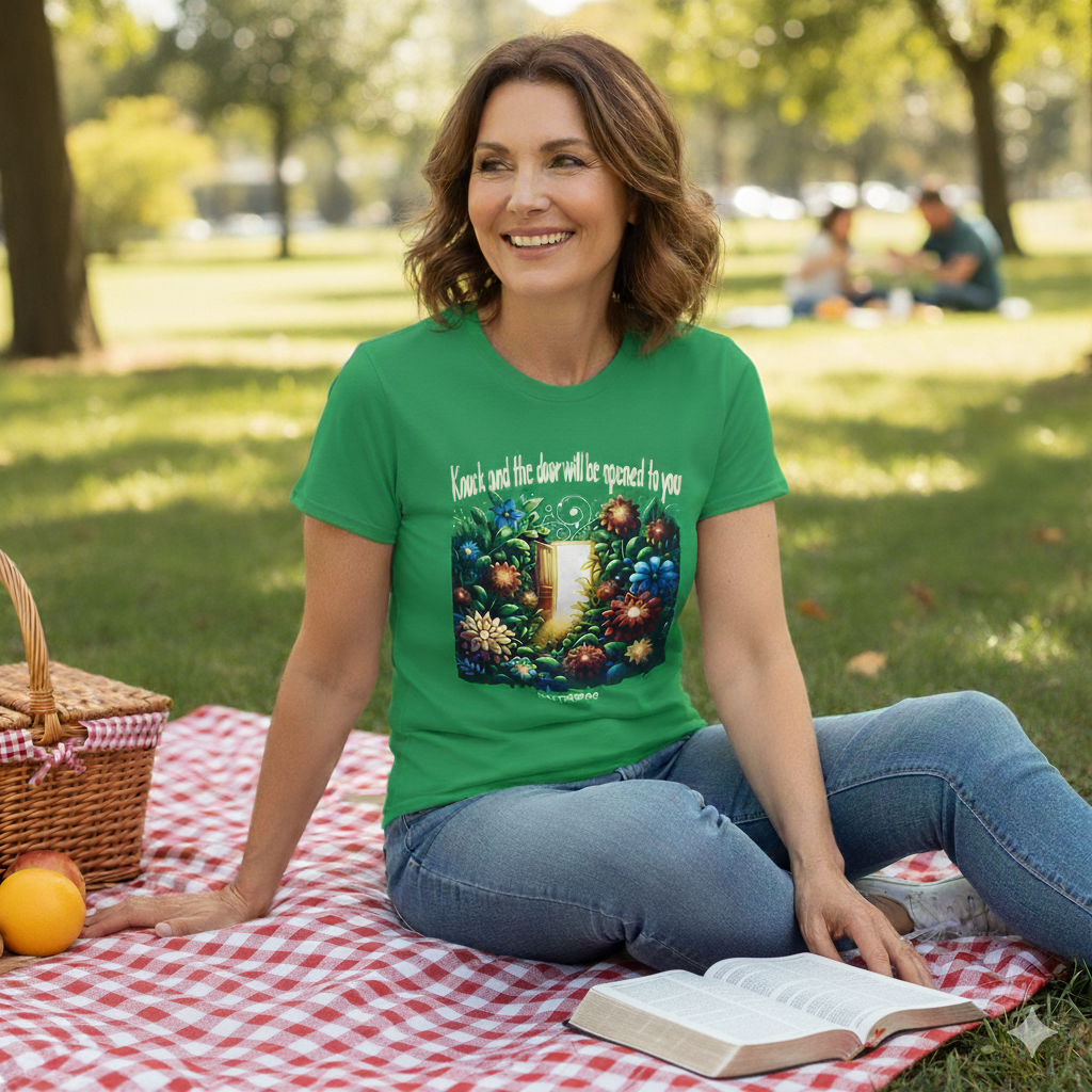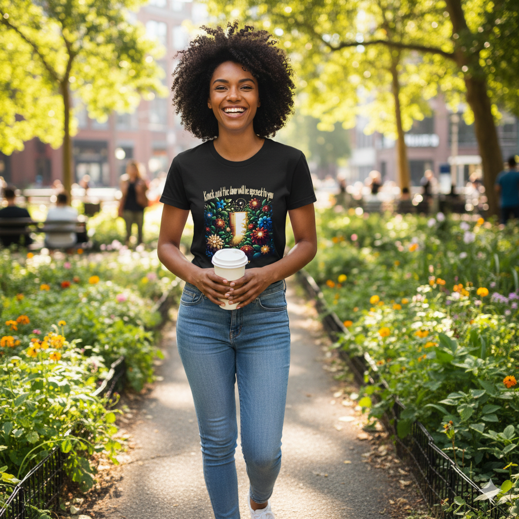 Step into a world of vibrant faith with our Knock and the door will be opened to you Christian T-shirt. This beautifully designed tee features a luminous doorway encircled by a cascade of colorful flowers, symbolizing the promise and hope found in the Bible verse, Matthew 7:7.