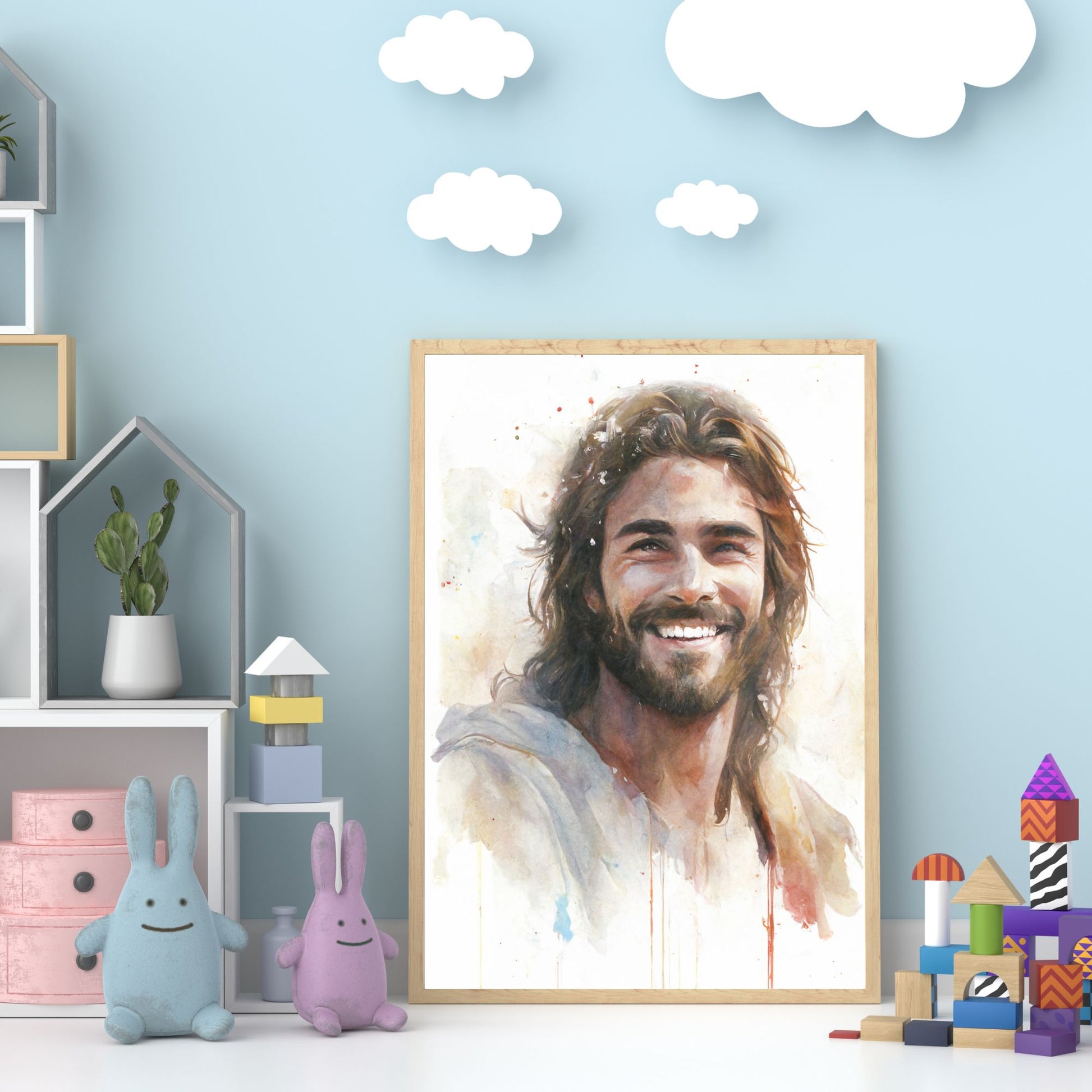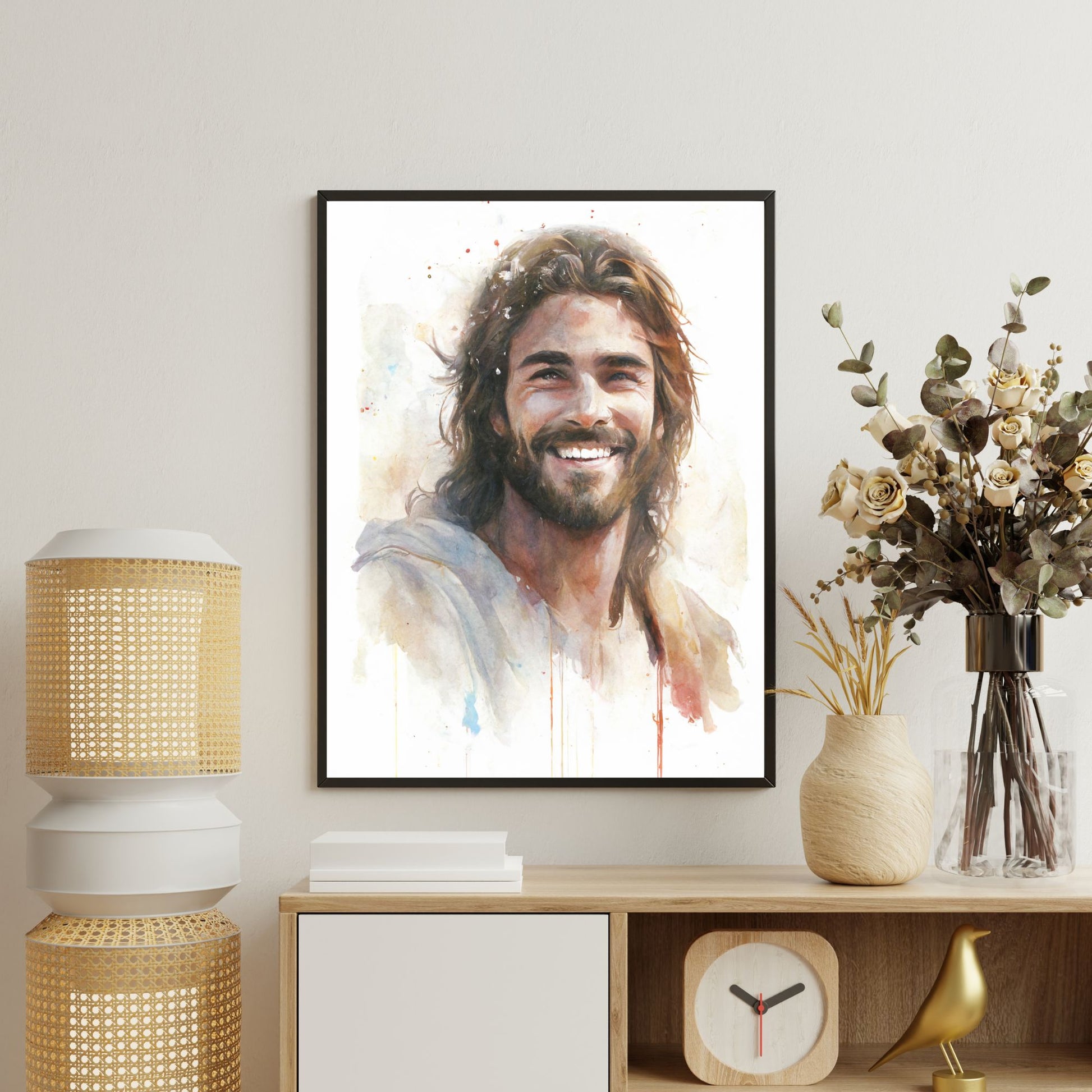 Messiah's Smile is a Watercolor-Style Portrait of Jesus that radiates joy, kindness, and approachable divinity. This contemporary Christian art print features soft, luminous washes and expressive detail that highlight Christ’s gentle, welcoming nature—ideal for creating a peaceful, uplifting atmosphere in homes, prayer rooms, or Sunday School spaces.