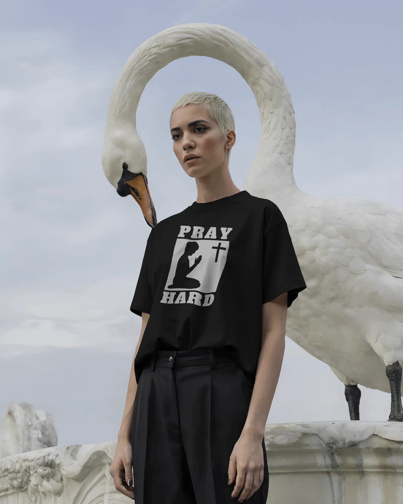 Introducing our minimalist Christian Women's black and white T-shirts that carries a powerful message of faith: Pray Hard.