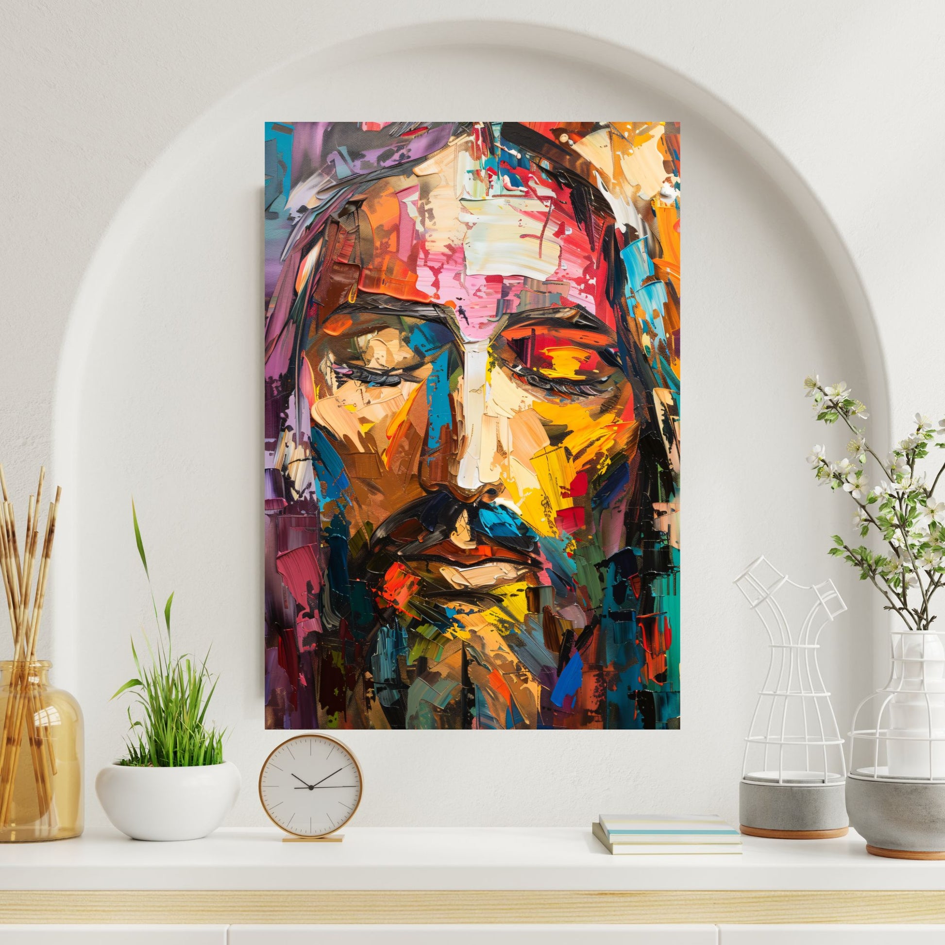Rainbow Christ is a modern Christian art print that bursts with vivid, expressive brushstrokes to create a powerful, contemplative portrait of Jesus. This contemporary design uses bold, layered colors to evoke emotion and depth, making it perfect for modern homes, creative prayer spaces, or anyone seeking an inspiring statement of faith that combines tradition with artistic energy.