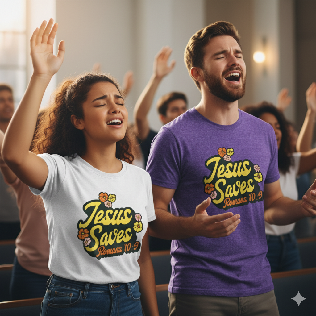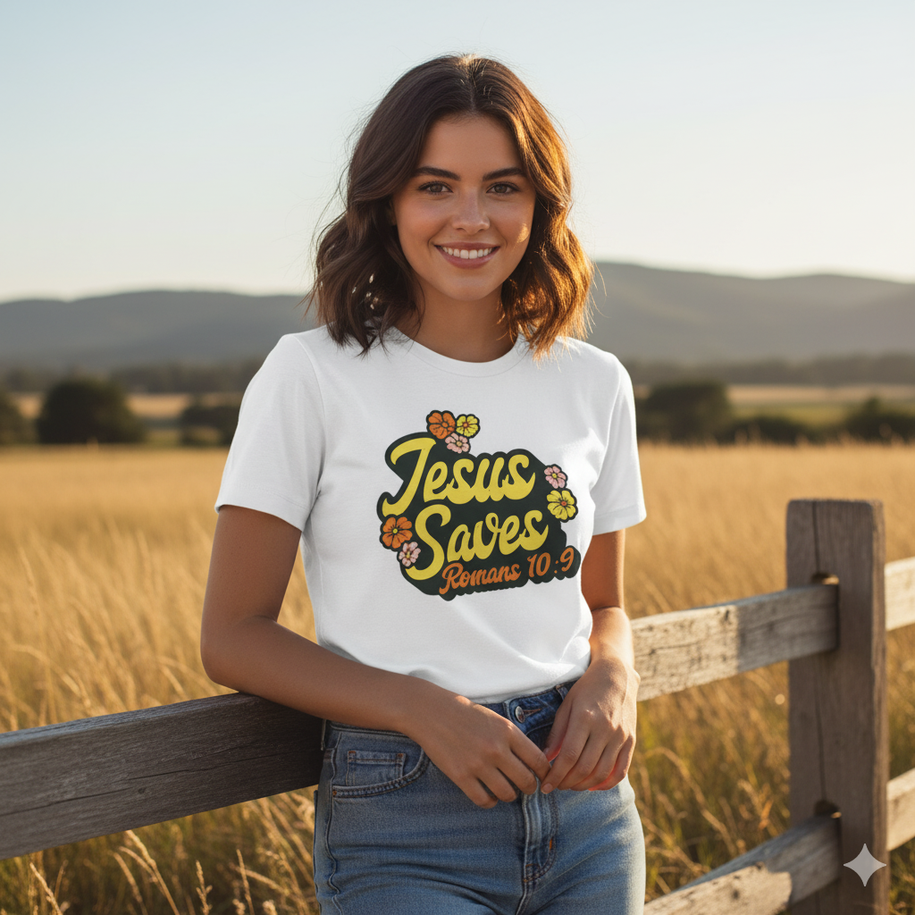 Step into a groovy expression of faith with our Jesus Saves Christian T-shirt, artfully combining retro 1960s fashion and timeless faith expressed in the Bible verse, Romans 10:9.