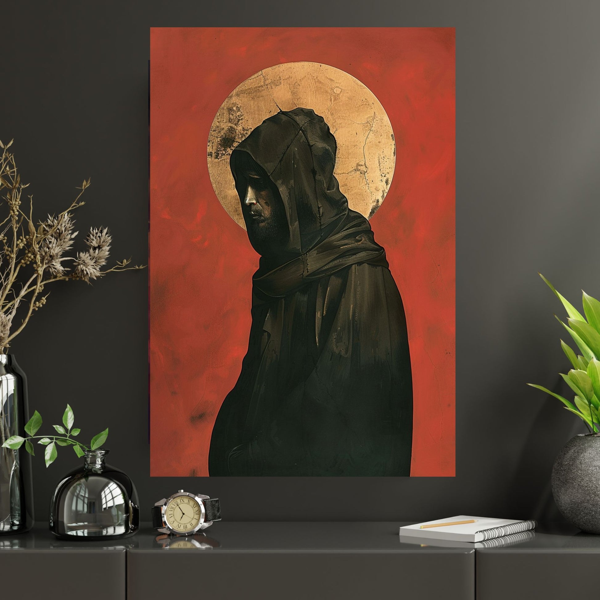 Saint Francis Contemplative is a modern style Catholic art print that captures the solemn, introspective side of Saint Francis of Assisi. With a striking red and gold backdrop and a minimalist yet evocative pose, this portrait brings a sense of quiet reverence and spiritual depth to prayer spaces, chapels, or Catholic homes dedicated to reflection and devotion.