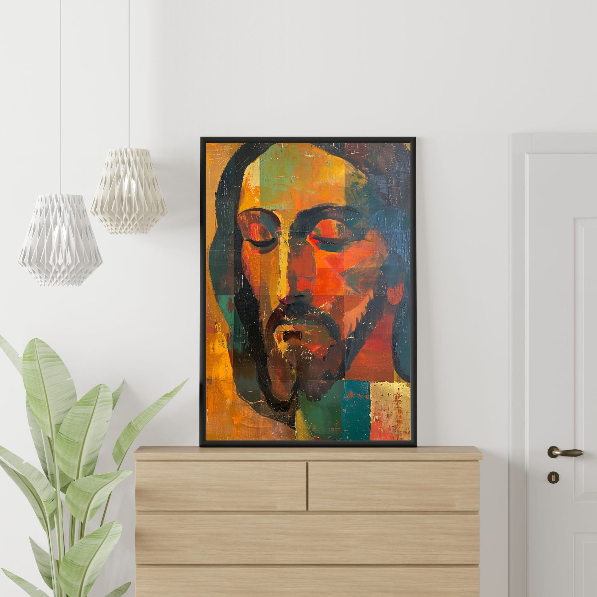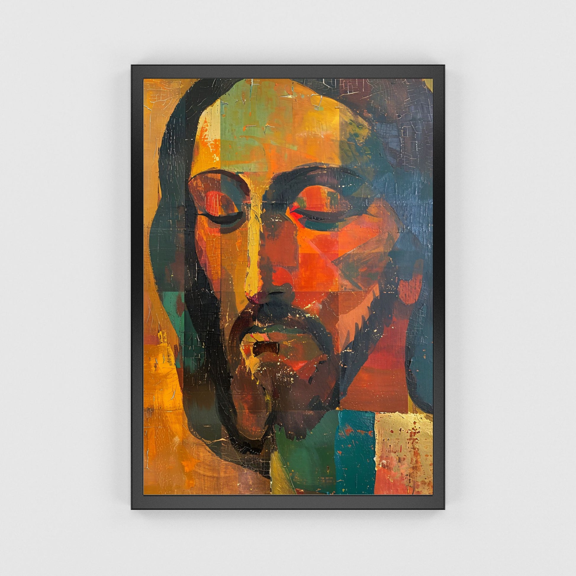 The Silent Christ is a modern abstract portrait that blends expressive color blocks and textured brushwork to depict Jesus in quiet contemplation. This striking Christian art print brings a bold, contemporary aesthetic to your home, prayer room, or sacred space while inviting deep spiritual reflection.