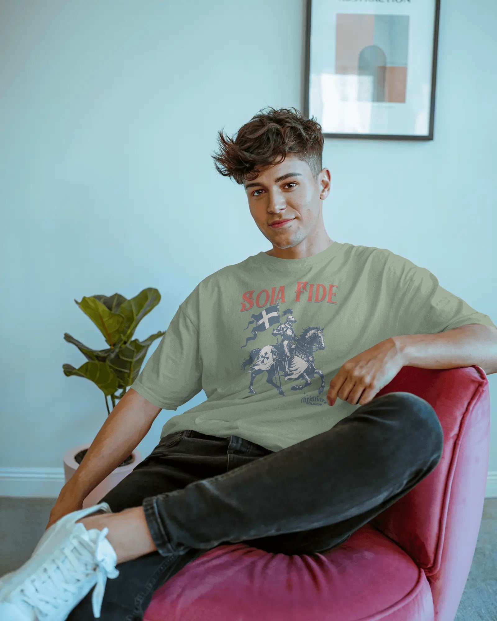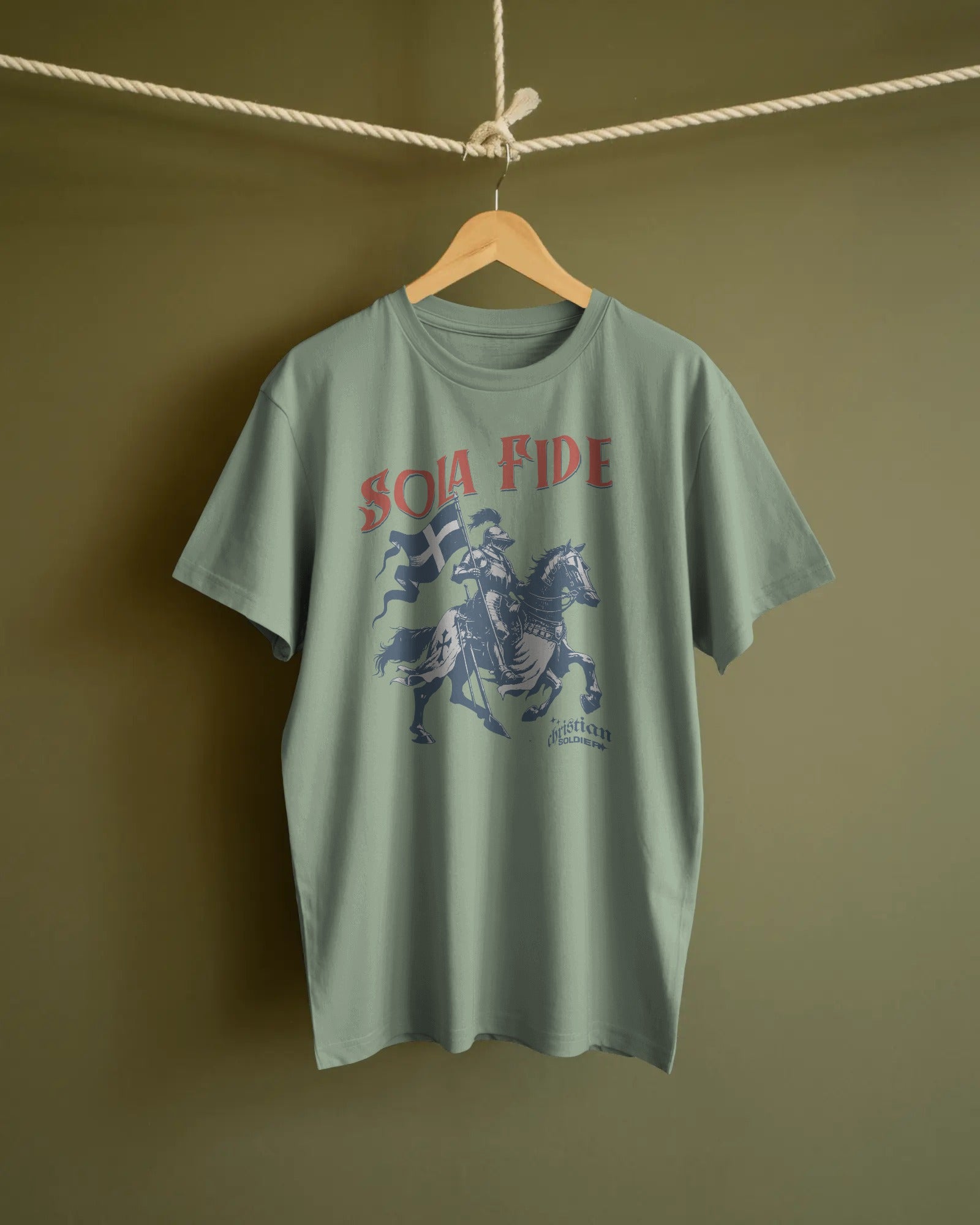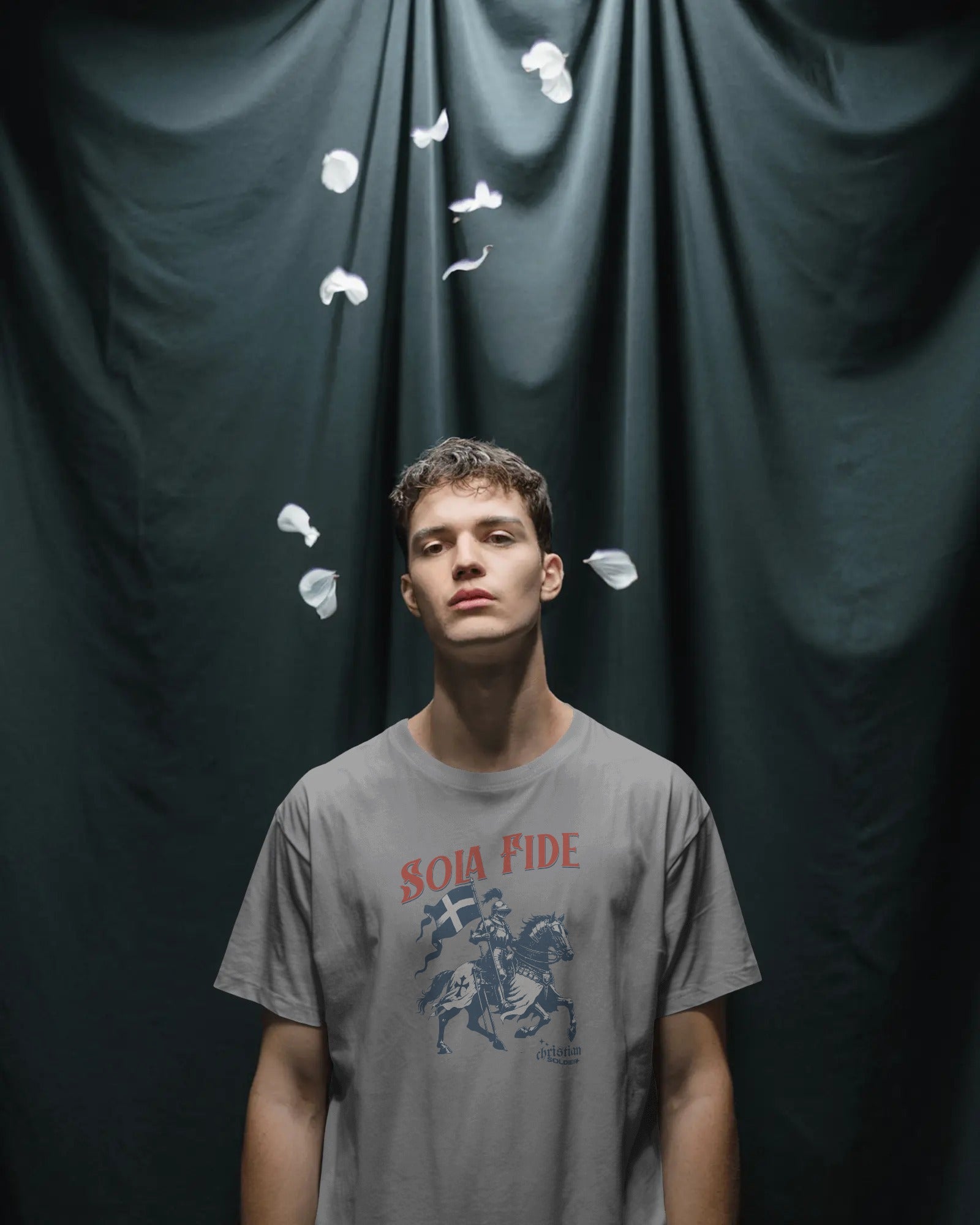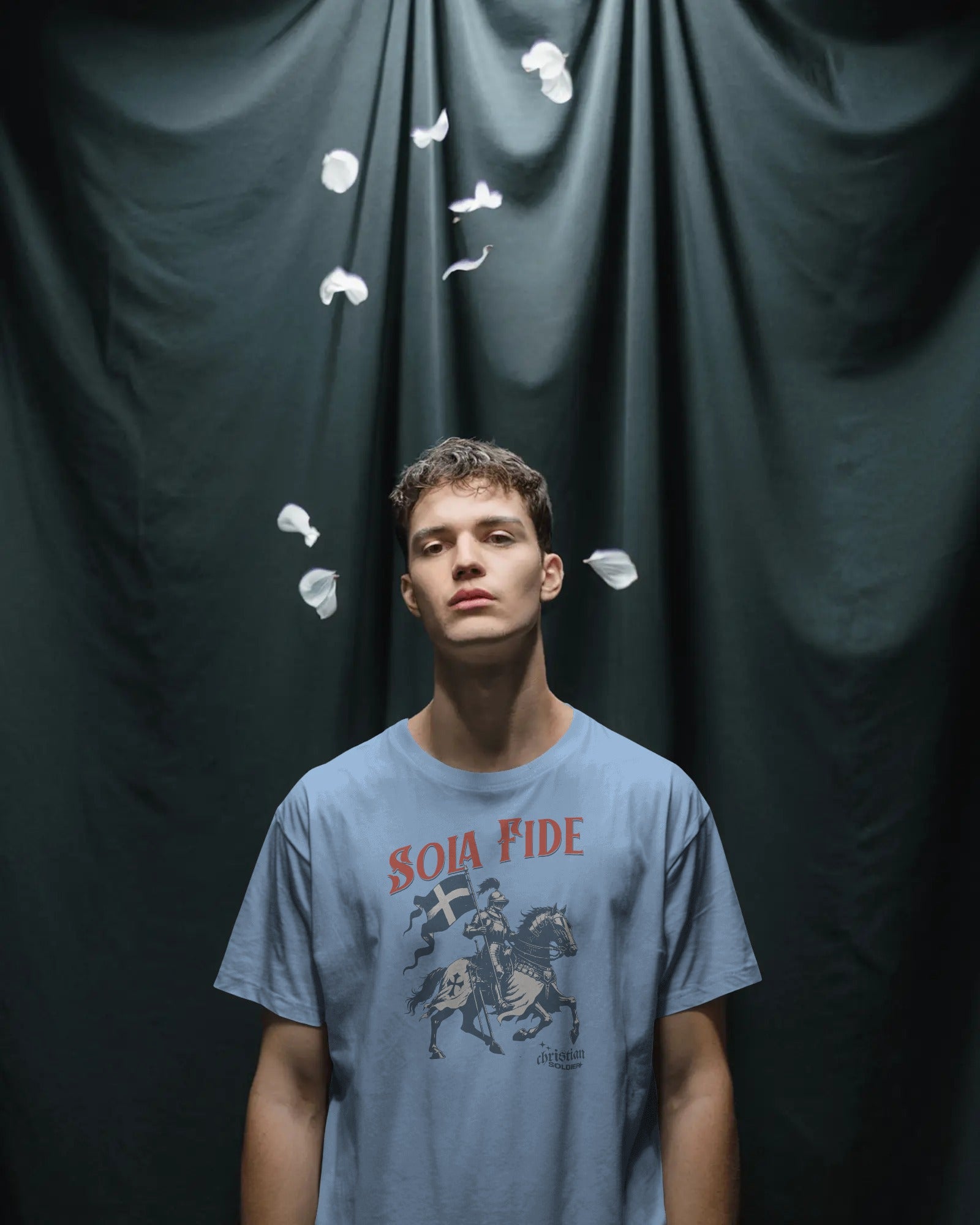 Declare your Christian faith and celebrate your Protestant heritage with our Sola Fide T-shirt, adorned with a stalwart knight. This powerful Latin phrase, meaning 'by faith alone,' is a cornerstone of Protestant theology, underscoring the belief that salvation comes solely through faith in Jesus Christ.