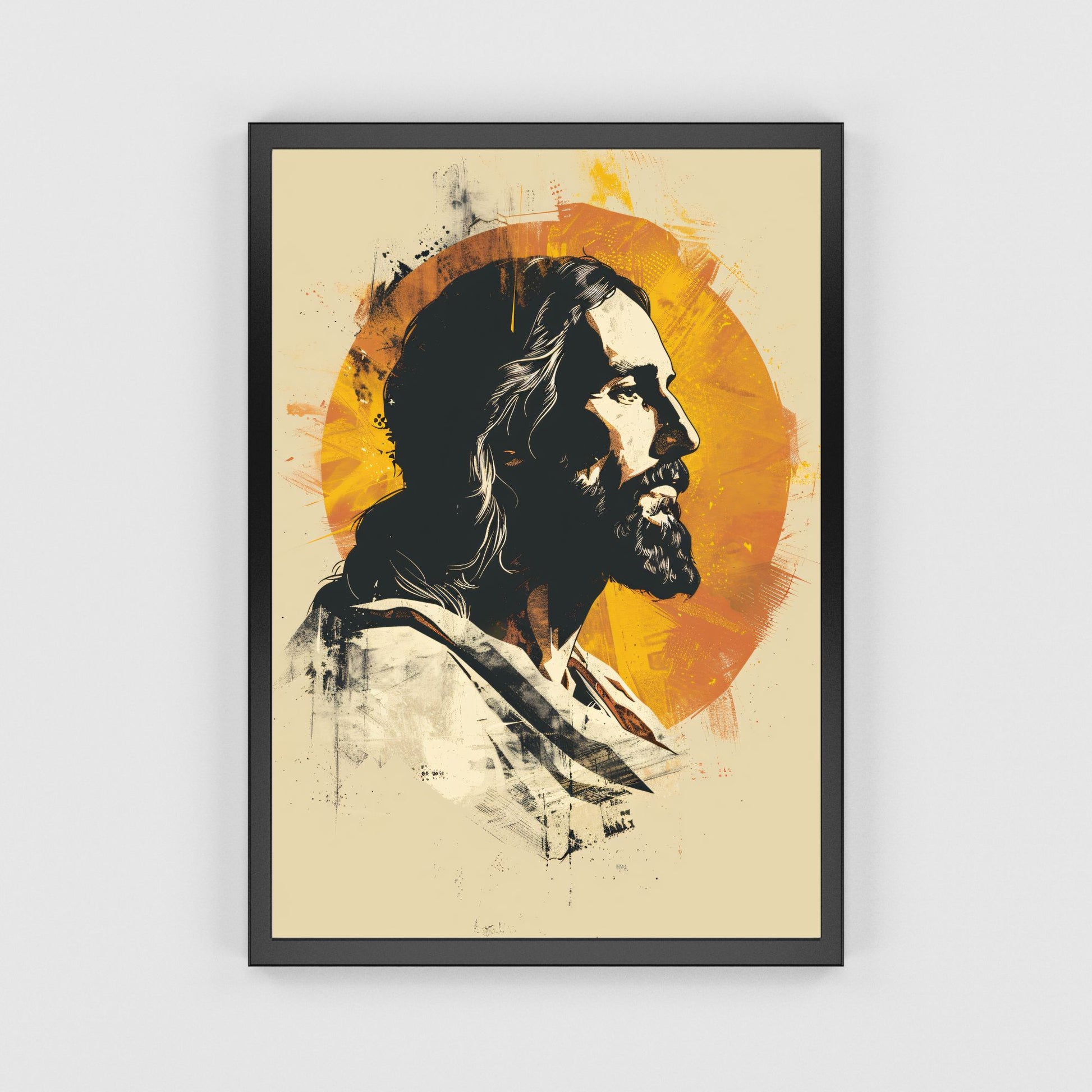 Golden Halo is a contemporary graphic art print featuring a profile of Jesus in bold, stylized lines with a rich, radiant yellow background that evokes strength and spiritual illumination. Available in multiple sizes, framed or unframed, it’s designed to add modern, faith-filled impact to your home, office, or church.