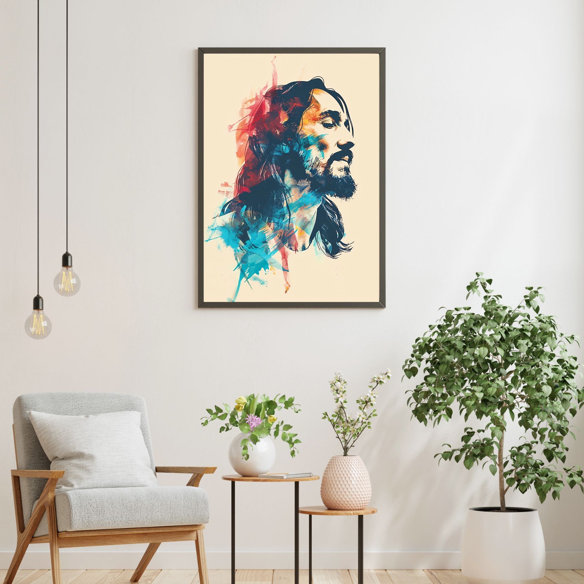 Spirit And Color is a modern abstract art print featuring Jesus in dynamic, expressive splashes of red and blue, blending contemporary design with spiritual depth. Available in multiple sizes, framed or unframed, it’s designed to bring vibrant, faith-filled artistry to your home, office, or church.