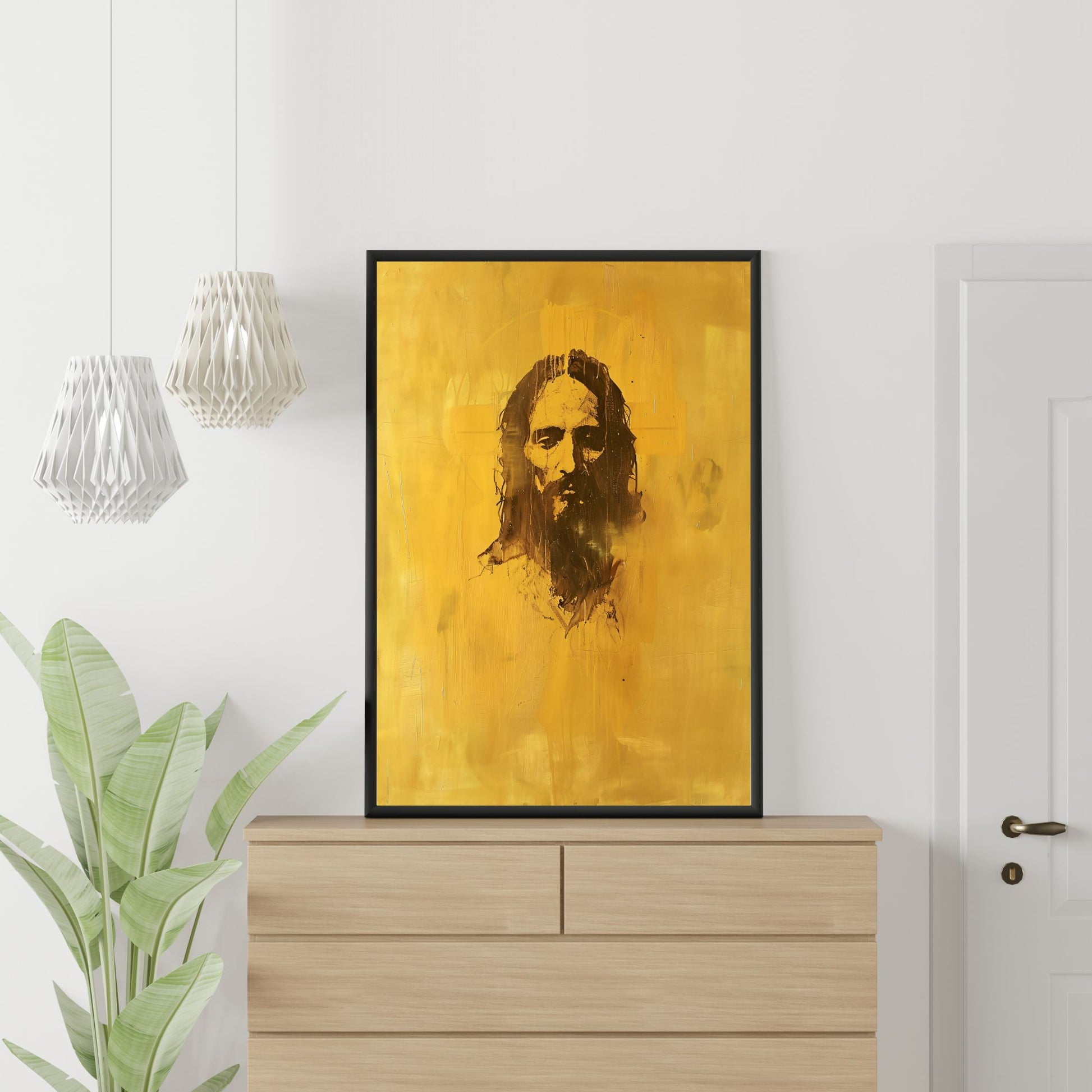 Veiled Light is a minimalist midcentury modern art print featuring a subtle, evocative portrait of Jesus against a warm golden background with restrained, painterly detail. Available in multiple sizes, framed or unframed, it’s designed to bring quiet, faith-filled sophistication to your home, office, or church.